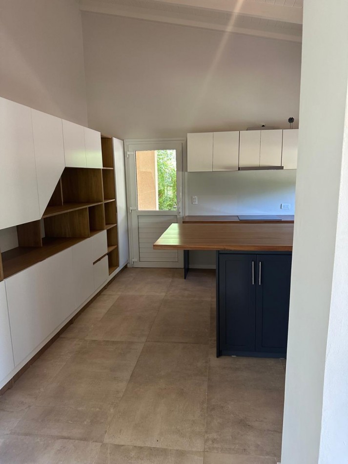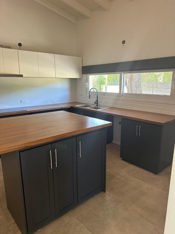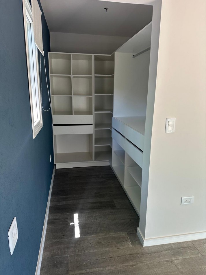 La distribución incluye dos dormitorios en suite —uno con vestidor y otro con placard exterior—, tres baños (uno de servicio junto al comedor) y una cocina amplia con isla central y gran espacio de guardado, ideal para cocinar y compartir.